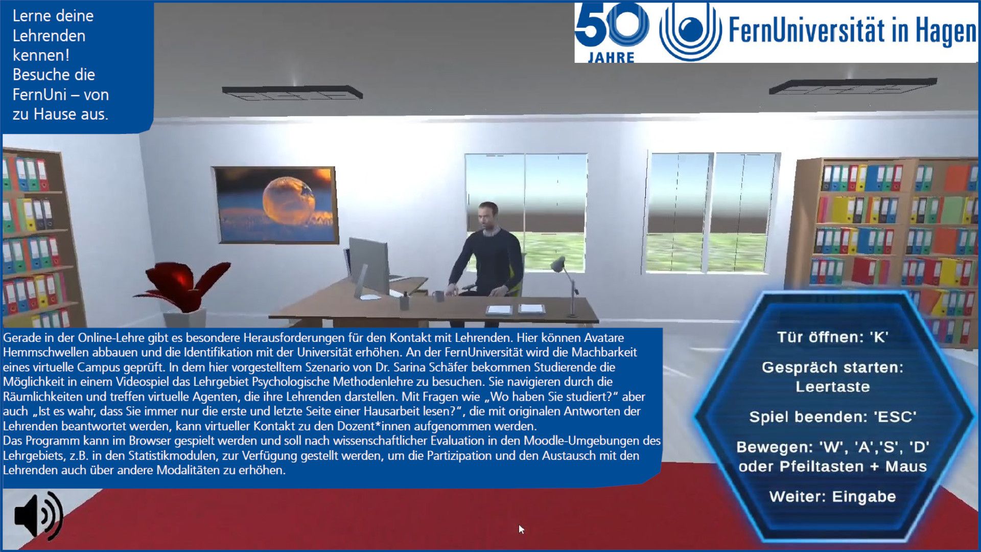 Gerade in der Online-Lehre gibt es besondere Herausforderungen für den Kontakt mit Lehrenden. Hier können Avatare Hemmschwellen abbauen und die Identifikation mit der Universität erhöhen. An der FernUniversität wird die Machbarkeit eines virtuellen Campus geprüft. In dem hier vorgestelltem Szenario von Dr. Sarina Schäfer bekommen Studierende die Möglichkeit in einem Videospiel das Lehrgebiet Psychologische Methodenlehre zu besuchen. Sie navigieren durch die Räumlichkeiten und treffen virtuelle Agenten, die ihre Lehrenden darstellen. Mit Fragen wie „Wo haben Sie studiert?“ aber auch „Ist es wahr, dass Sie immer nur die erste und letzte Seite einer Hausarbeit lesen?“, die mit originalen Antworten der Lehrenden beantwortet werden, kann virtueller Kontakt zu den Dozent*innen aufgenommen werden.