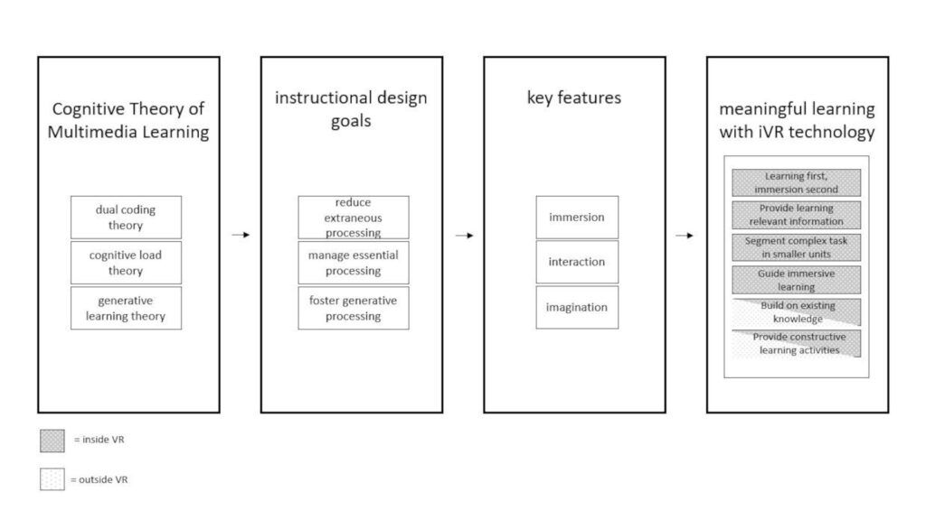 Das Framework umfasst klare Prinzipien, nach denen immersive Lehr- und Lernumgebungen gestaltet sein sollten. Lernen muss im Vordergrund stehen, Interaktionen müssen sinnvoll sein, komplexe Inhalte brauchen eine geeignete Struktur, Lernende brauchen Anleitung, Vorwissen zählt und echter Lernerfolg entsteht durch aktives Mitmachen. Die folgende Illustration aus dem Paper gibt einen prägnanten Überblick: