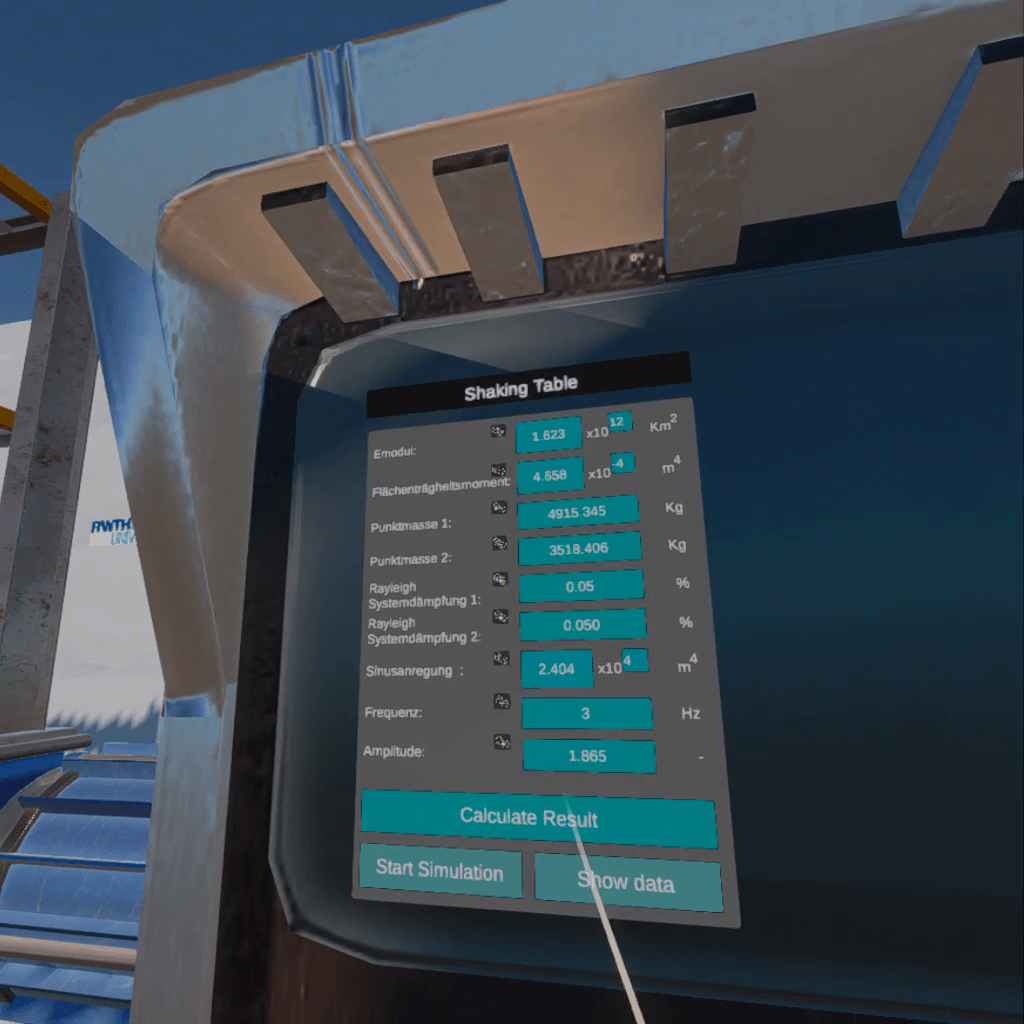 Die immersive Simulation wurde mithilfe des MyScore-Entwicklerteams in einer Standalone-Anwendung implementiert. Diese wird mithilfe einer eigens vom LBB implementierten FEM-Library direkt auf der VR-Brille berechnet und dann immersiv dargestellt. So können Studierende die wirkenden Kräfte eindrucksvoll und in realen Proportionen wahrnehmen, ohne dabei in die Versuchshalle kommen zu müssen. Einen Überblick über die Eingabeparameter und die dargestellte Simulation geben die Bilder und das Kurzvideo.